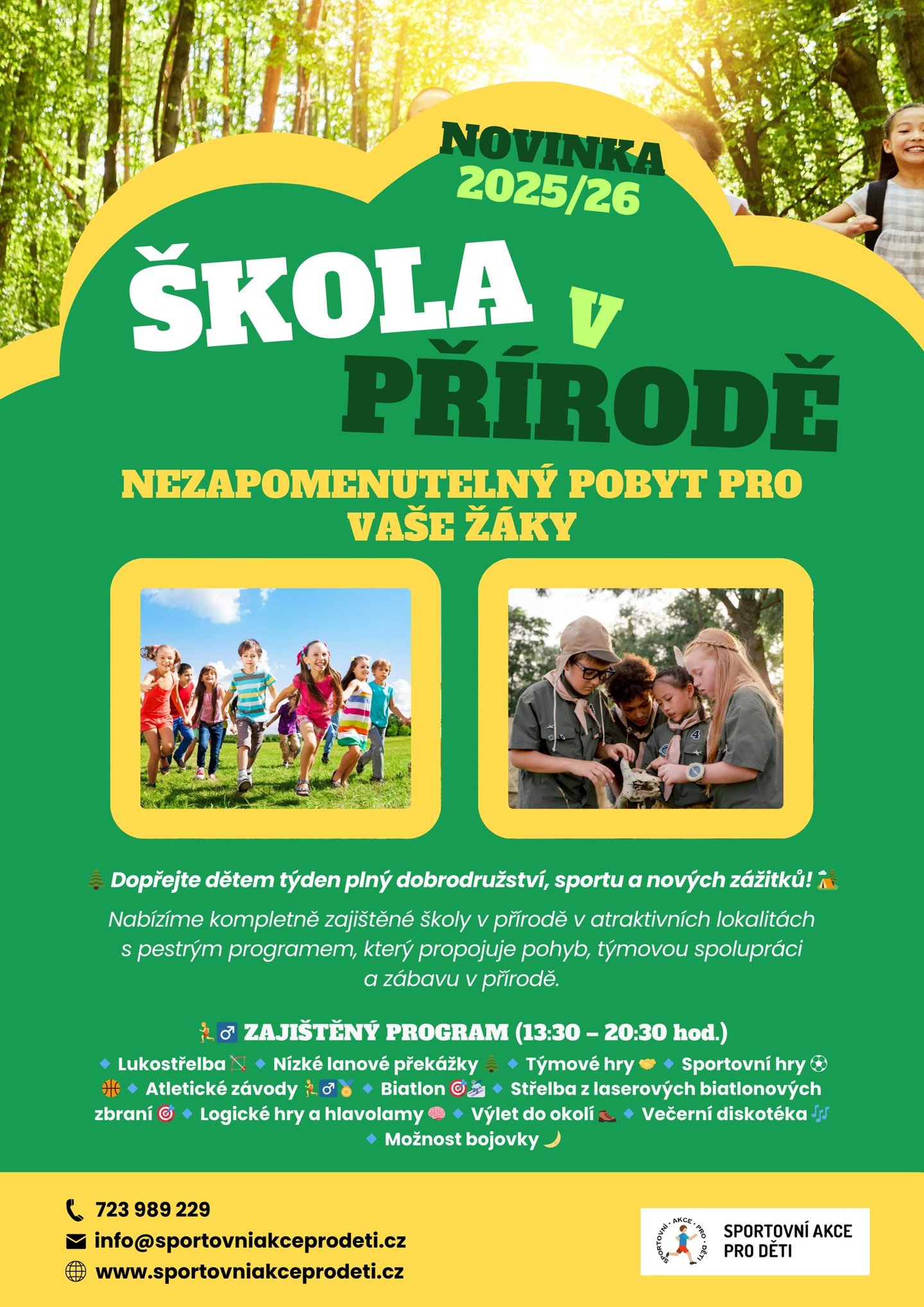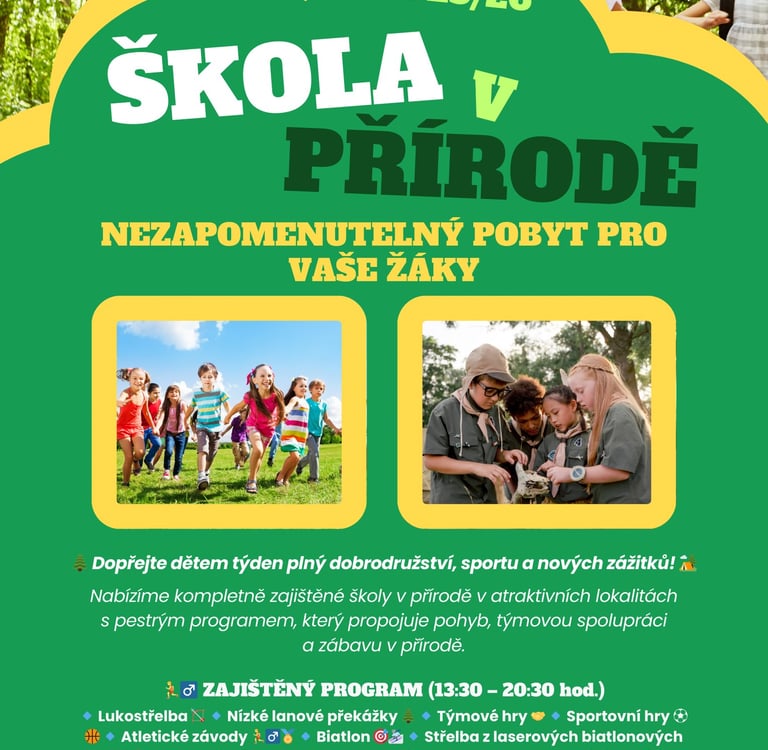 Nabízíme kompletně zajištěné školy v přírodě v atraktivních lokalitách s pestrým programem, který propojuje pohyb, týmovou spolupráci a zábavu v přírodě.