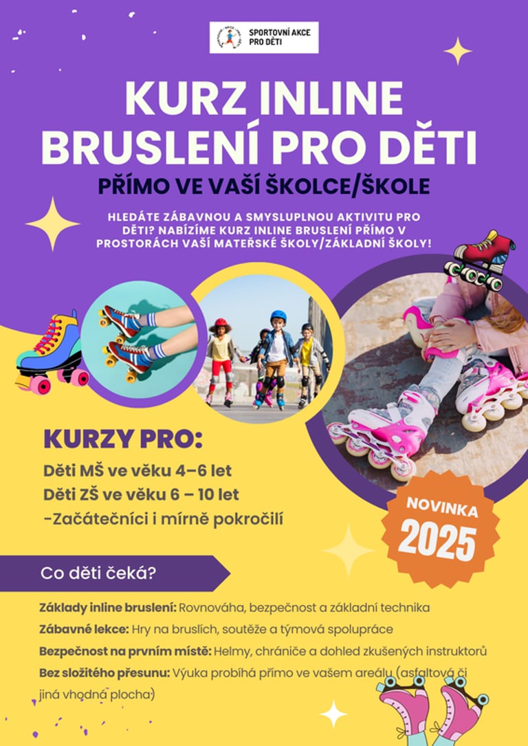 Hledáte zábavnou a smysluplnou aktivitu pro děti? Nabízíme kurz inline bruslení přímo v prostorách vaší mateřské školy/základní školy!
