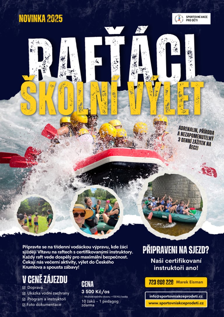 Připravte se na třídenní vodáckou výpravu, kde žáci sjíždějí Vltavu na raftech s certifikovanými instruktory. Každý raft vede dospělý pro maximální bezpečnost. Čekají nás večerní aktivity, výlet do Českého Krumlova a spousta zábavy!