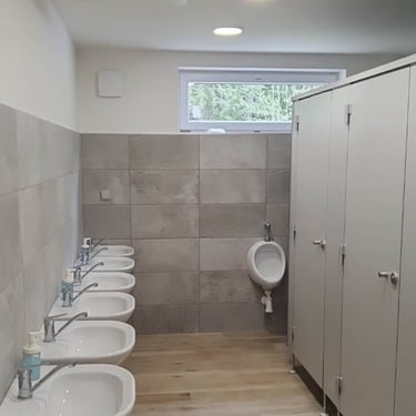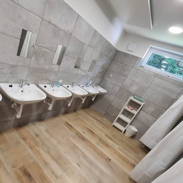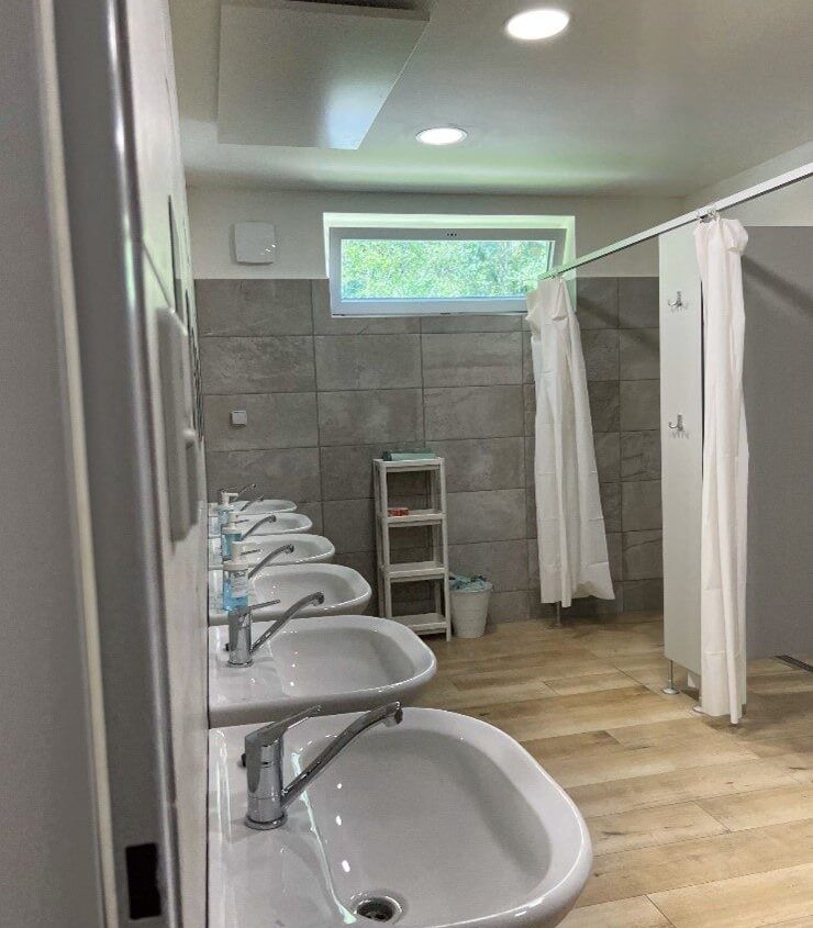 Ubytování: Menší děti v pokojích, větší v chatkách, prostory vč. koupelen čisté po rekonstrukci