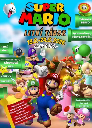 Po velkém úspěchu našeho prvního ročníku jsme zpět – a s ještě lepším programem! Letošní léto se ponese ve znamení dobrodružství se Super Mariem. Čeká nás týden plný akce, pohybu a nezapomenutelných zážitků s kamarády.